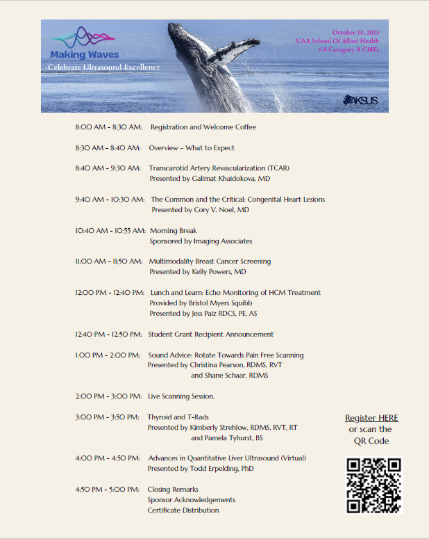 This year, as in the past several years, we are joining with AKSRT - the Alaska Society of Radiologic Technologists - in their annual conference, sharing joint speakers and having lots of ultrasound-specific breakout sessions. Last year we had 13 SDMS CME's available. This year we hope for even more!